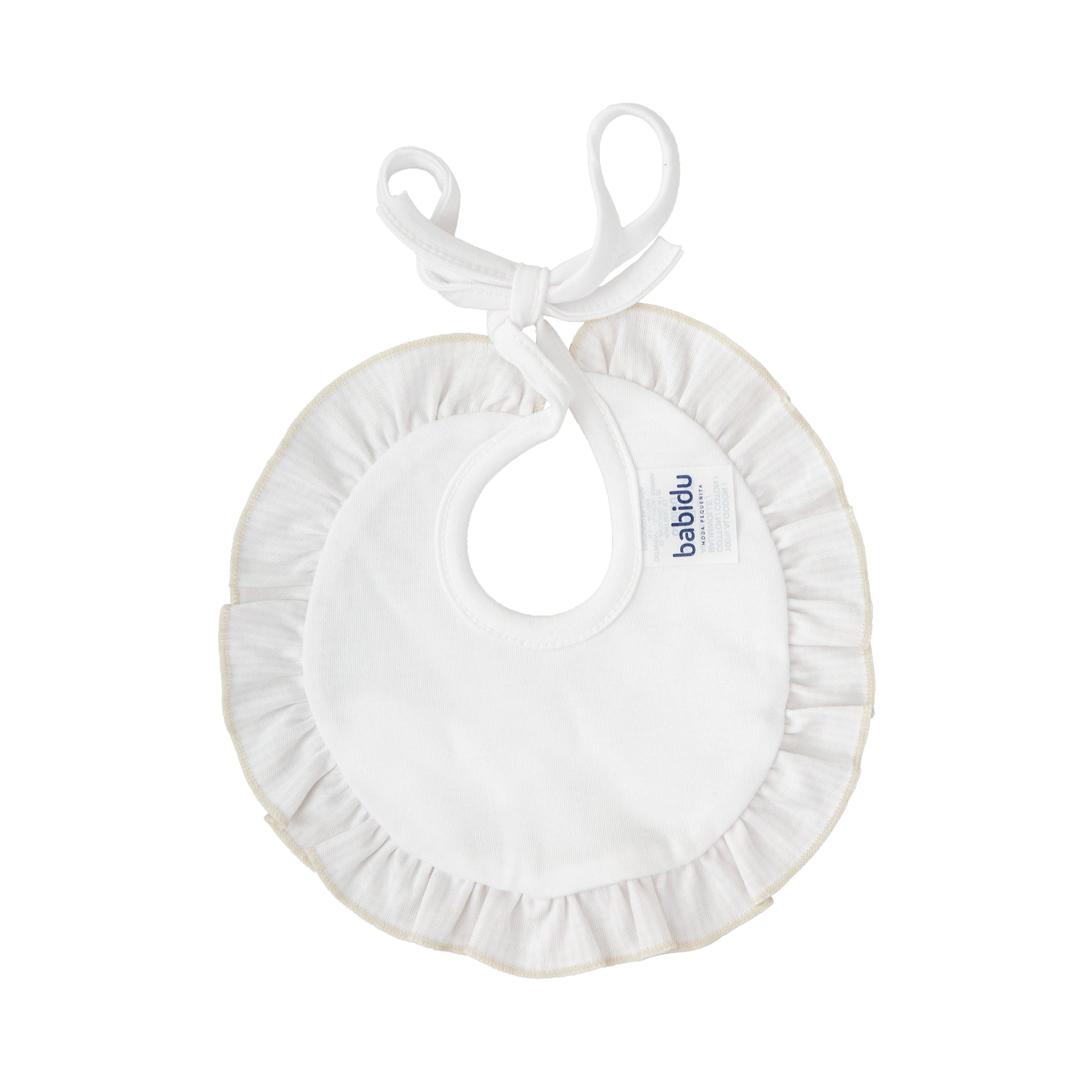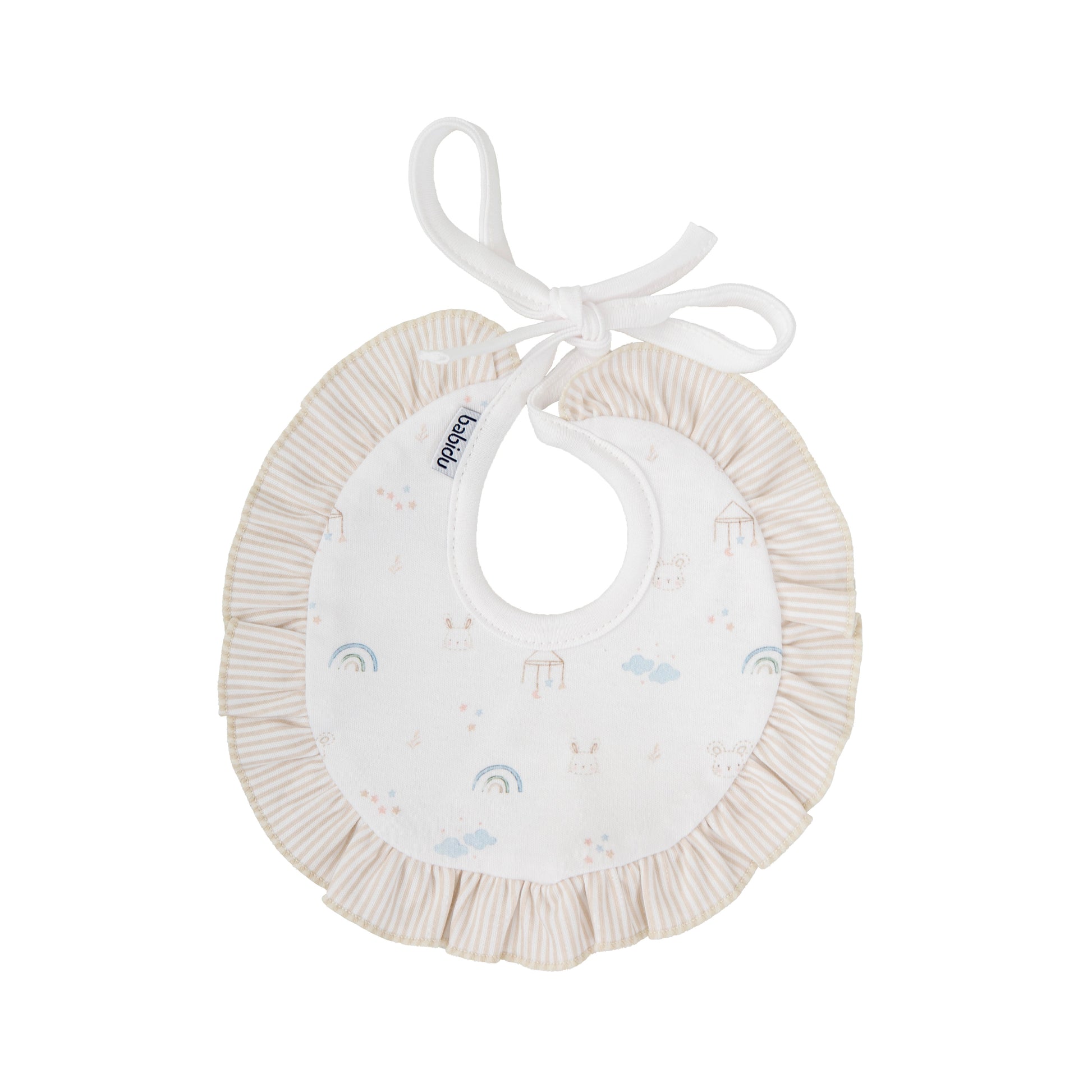 Babero con volante a rayas y estampado de arcoíris y nubes en tonos pastel.