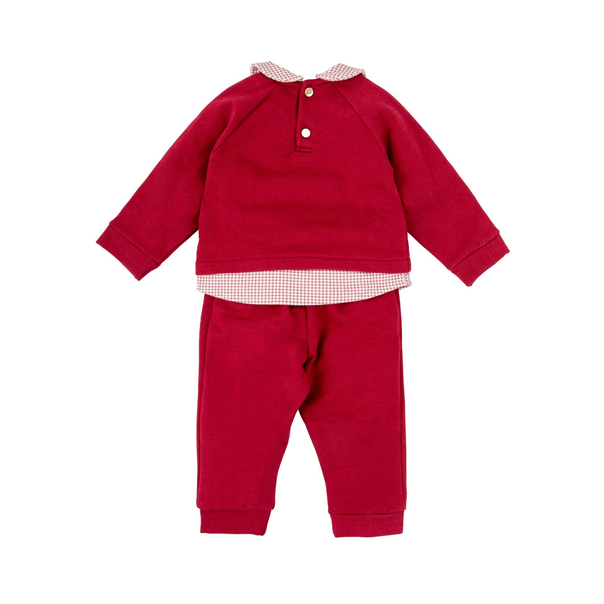Conjunto de dos piezas para bebé en color burdeos es perfecto para los días más frescos. La sudadera, con cuello camisero en tejido vichy a juego con el dobladillo interior, está decorada con un divertido bordado de osito con corona, aportando un toque dulce y original. El pantalón largo a juego, en el mismo tono, completa un conjunto cómodo y cálido para el día a día. Ideal para bebés que combinan estilo y confort desde sus primeros meses.