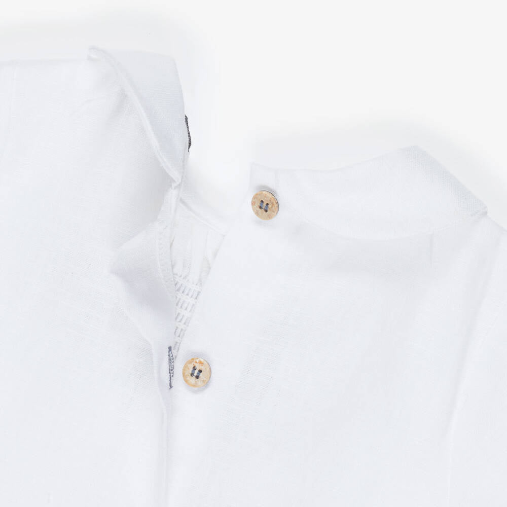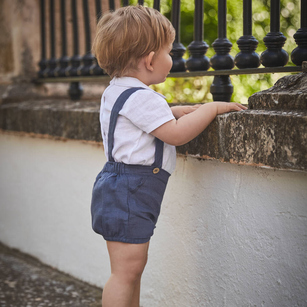 Conjunto de bebé compuesto por camisa de manga corta con cuello bebé y pantalón corto con tirantes, un diseño clásico y elegante ideal para los días de verano.
