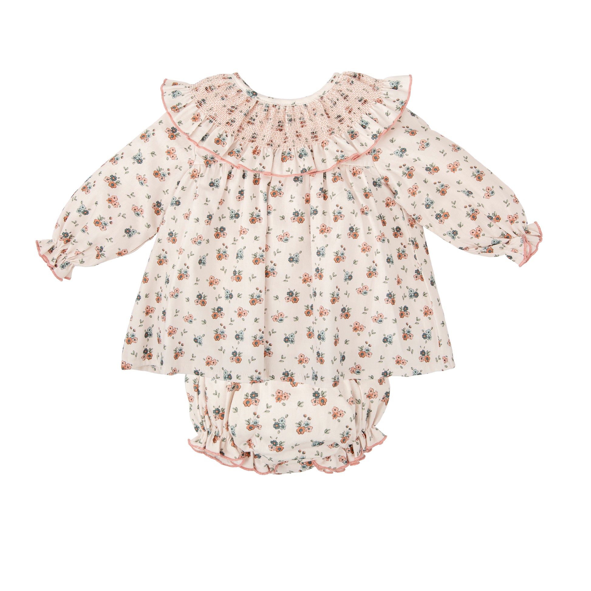 Este conjunto para bebé es una joya del vestuario infantil, pensado para aportar dulzura y distinción en cada ocasión especial. Incluye una blusa de manga larga y un cubrepañal a juego, ambos confeccionados en algodón 100% con un delicado estampado de flores en tonos rosados, coral y azul sobre fondo marfil.