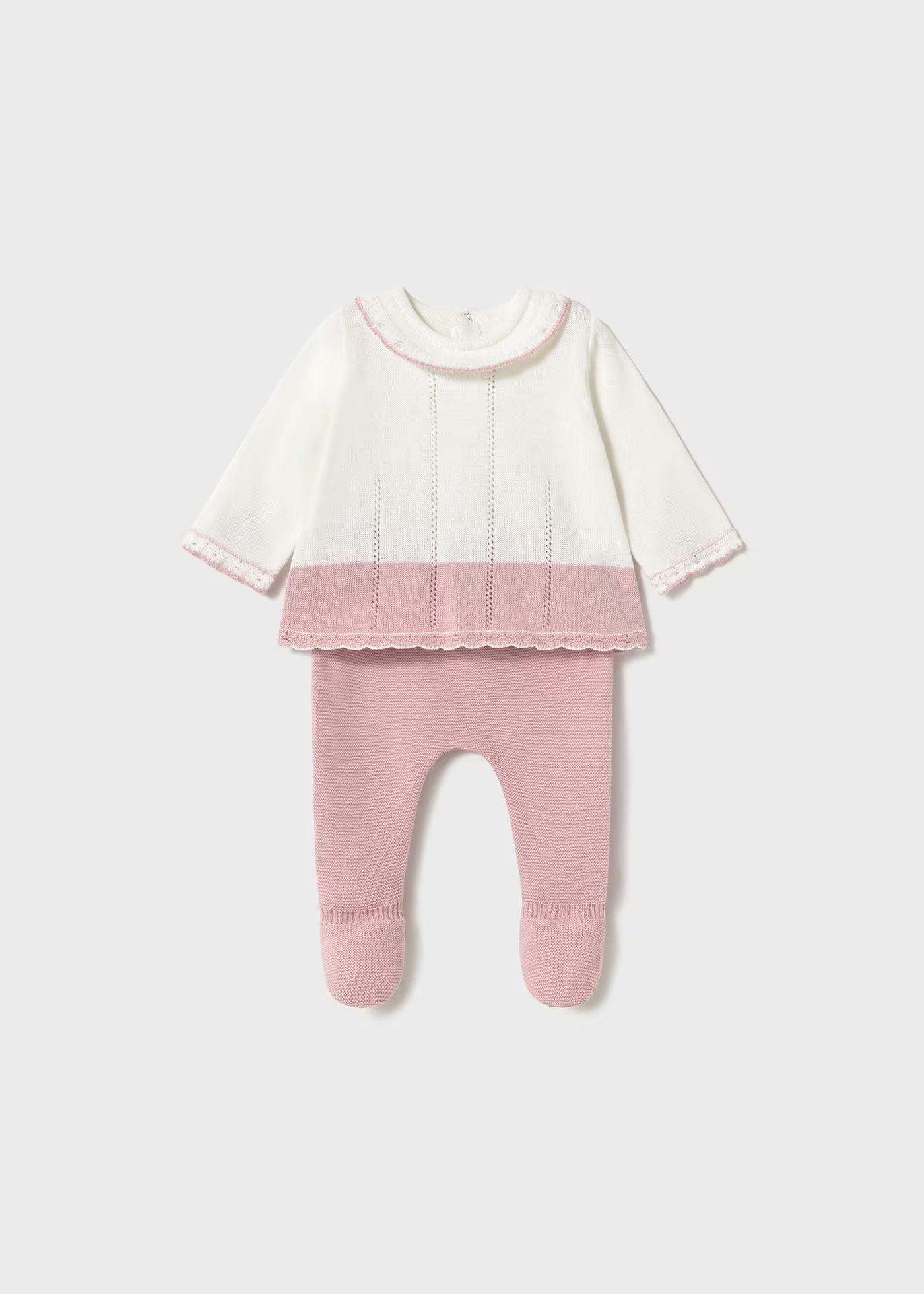 Este Conjunto de 2 Piezas de Punto es la combinación perfecta de elegancia y confort. Compuesto por una chaqueta abotonada y polaina con pies cubiertos, está diseñado para brindar abrigo y dulzura en cada detalle. Disponible en dos delicados tonos: blanco con rosa empolvado y blanco con beige claro, ideal para cualquier ocasión.