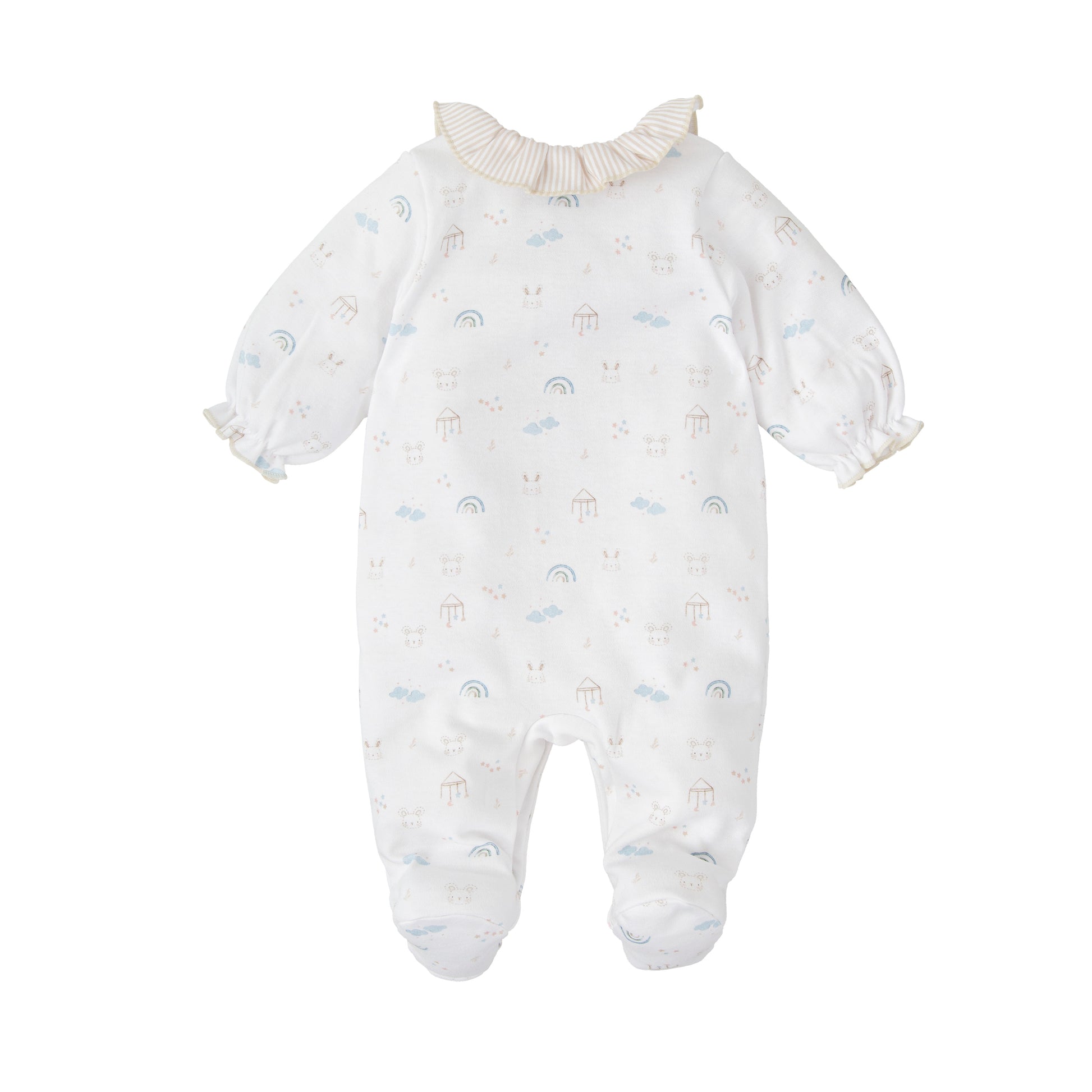 Pelele blanco de suave algodón de jersey de la marca Babidu, con un estampado completo de arcoíris y móviles. Lleva un cuello con volante de rayas beige, bolsillos delanteros decorativos y ribetes a juego en los pies. Se abrocha con corchetes en la parte delantera y entre las piernas.