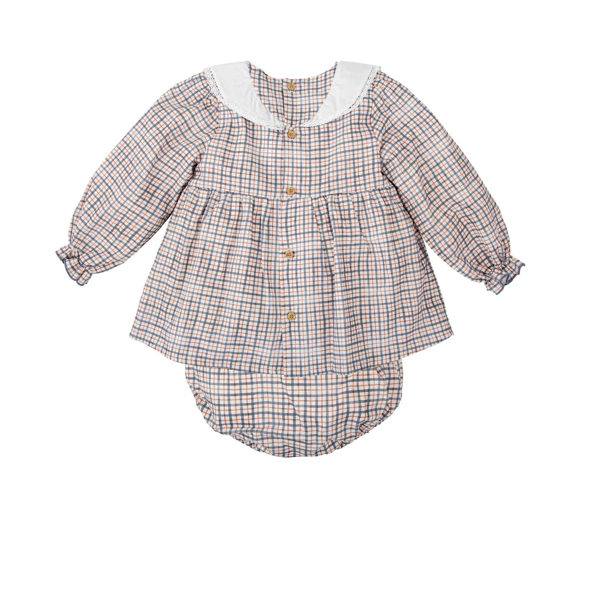 Vestido de niña con delicado estampado floral en tonos rosados y azul marino sobre fondo crudo. Detalle de lazo azul en el pecho que aporta un toque sofisticado y encantador. Cuello con volante fruncido y ribete azul, combinado con manga larga abullonada con fruncido en los puños. Un diseño ideal para eventos especiales o para el día a día con un toque elegante.